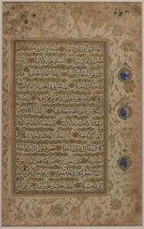 | Keywords: Naskh script - Qur'anic verses - 2.jpg en The verses 1-20 of the chapter of the Qur'an entitled al-Muzzammil The Enshrouded One The text is executed in a clear naskh and outlined by gold cloud bands decorated with red and blue flowers Diacritics are executed in black ink while some pronunciation and reading signs are picked out in red ink Verse markers consist of six-petalled gold rosettes decorated with blue dots and red lines The script text layout and illumination are all typical of Safavid Qur'ans produced during the second half of the 16th century in the southwestern Iranian city of Shiraz http //memory loc gov/service/amed/ascs/231/0002 jpg Library of Congress Unknown Calligrapher circa 1550 1600 PD-Art Naskh script Qur'an manuscripts 16th century Library of Congress Arabic Persian and Ottoman calligraphy collection Safavid art Islamic illumination Manuscripts in Iran Cloud bands Scrolls in art |