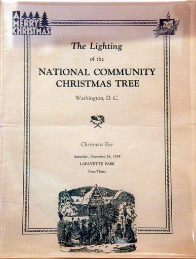 | Keywords: National Community Christmas Tree Lighting Ceremony Program 1938.jpg en The program from the lighting ceremony for the 1938 National Community Christmas Tree The United States first hosted a National Christmas Tree in 1923 At the time it was a cut tree and erected in the center of The Ellipse From 1924 to 1933 a live tree was planted in Sherman Square south of the U S Department of the Treasurer Building In 1934 two live Fraser fir trees were planted in Lafayette Square The trees alternated as the National Christmas Tree to help reduce damage to the trees from the heavy ornaments and lights The last time they were used was 1938 In 1939 and 1940 two red cedar trees were temporarily moved to the north edge of The Ellipse In 1941 two Oriental spruce trees were planted on the South Lawn of the White House and again used in alternative years as the National Christmas Tree Cut trees were again used beginning in 1954 and the tree was moved to the north edge of The Ellipse again The cut tree was replaced with a live tree in 1973 It's been replaced several times but a live tree has been used ever since http //www flickr com/photos/23165290 N00/7235952910/ United States Department of the Interior original document ; Tim Evanson photograph December 1938 original document ; 2012-05-15 White House in 1938 Christmas 1938 U S National Christmas Trees PD-USGov cc-by-sa-2 0 dctim1 http //flickr com/photos/23165290 N00/7235952910 2012-05-30 22 50 12 cc-by-sa-2 0 Files from Tim Evanson Flickr stream |