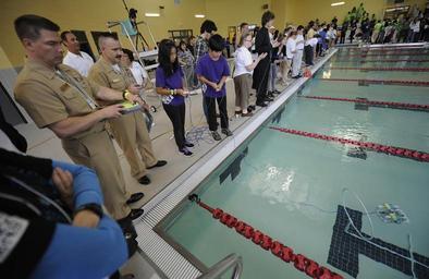 | Keywords: National SeaPerch Challenge 120412-N-PO203-002.jpg en Capt Robert Palisin left deputy department head for the sea warfare and weapons department at the Office of Naval Research and Master Chief Machinist's Mate Frank Gardner from Commander Submarine Force U S Atlantic Fleet judge Highland Intermediate School students from Pearl City Hawaii during the ONR-sponsored National SeaPerch Challenge at the Manassas Park Community Center in Manassas Va The SeaPerch program provides students with the opportunity to learn about robotics engineering science and mathematics while building an underwater remotely operated vehicle as part of a science and engineering technology curriculum 2012-04-12 John Williams https //www dvidshub net/image/559148 120412-N-PO203-002 2012-04-13 23 09 MANASSAS PARK VA US PD-USGov-Military-Navy Office of Naval Research Images from DoD uploaded by Fæ |