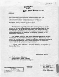 | Keywords: National Security Action Memorandum No. 105 Policy Toward Egypt and Syria - NARA - 193498.jpg Scope and content Memorandum for Secretary of State on U S policy towards Egypt and Syria General notes 193498 Local identifier President 1961-1963 Kennedy Office of the Special Assistant to the President for National Security Affairs 01/20/1961 - 11/22/1963 NARA-Author Bundy McGeorge 1919-1996 Author 1128212 <br /> John F Kennedy Library NLJFK Columbia Point Boston MA 02125-3398 1961-10-16 Record group Collection JFK-NSF Papers of President Kennedy National Security Files 01/20/1961 - 11/22/1963 Record group ARC 1164 National Security Files Meetings and Memoranda compiled 1961 - 1963 Series ARC 193354 File unit National Security Files Meetings and Memoranda National Security Action Memoranda 02/03/1961 - 11/13/1963 File unit ARC 193400 Variant control numbers NAIL Control Number NLK-NSF-MM-NSAM-10EEEH Other versions <gallery> File National_Security_Action_Memorandum_No _105_Policy_Toward_Egypt_and_Syria_-_NARA_-_193498 tif tif File National_Security_Action_Memorandum_No _105_Policy_Toward_Egypt_and_Syria_-_NARA_-_193498 jpg jpg </gallery> NARA-cooperation PD-USGov Presidential Decision Directives Kennedy Gamal Abdel Nasser 1961 in Egypt United Arab Republic |