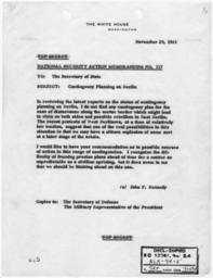 | Keywords: National Security Action Memorandum No. 117 Contingency Planning on Berlin - NARA - 193510.jpg Scope and content Memorandum for Secretary of State concerning contingency planning on Berlin General notes 193510 Local identifier President 1961-1963 Kennedy Office of the Special Assistant to the President for National Security Affairs 01/20/1961 - 11/22/1963 NARA-Author Kennedy John F John Fitzgerald 1917-1963 Author 1331563 <br /> John F Kennedy Library NLJFK Columbia Point Boston MA 02125-3398 1961-11-29 Record group Collection JFK-NSF Papers of President Kennedy National Security Files 01/20/1961 - 11/22/1963 Record group ARC 1164 National Security Files Meetings and Memoranda compiled 1961 - 1963 Series ARC 193354 File unit National Security Files Meetings and Memoranda National Security Action Memoranda 02/03/1961 - 11/13/1963 File unit ARC 193400 Variant control numbers NAIL Control Number NLK-NSF-MM-NSAM-10EEET Other versions <gallery> File National_Security_Action_Memorandum_No _117_Contingency_Planning_on_Berlin_-_NARA_-_193510 tif tif File National_Security_Action_Memorandum_No _117_Contingency_Planning_on_Berlin_-_NARA_-_193510 jpg jpg </gallery> NARA-cooperation PD-USGov Check categories-NARA 2011 September 19 Presidential Decision Directives Kennedy |