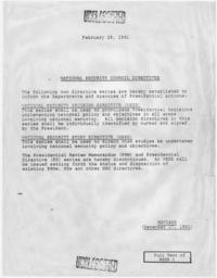 | Keywords: National Security Council Directives - NARA - 198167.jpg Scope and content General notes 198167 Local identifier President 1981-1989 Reagan National Security Council 1981 - 1989 Ronald Reagan Library NLRR 40 Presidential Drive Simi Valley CA 93065-0600 1981-02-25 Record group Collection RR-NSC Numbered National Security Policy Papers 1981 - 1989 Record group ARC 1189 National Security Decision Directives compiled 02/25/1981 - 01/19/1989 Series ARC 198166 File unit File unit ARC Variant control numbers NAIL Control Number NLS-NSC-NSDD-1 Other versions <gallery> File National_Security_Council_Directives_-_NARA_-_198167 tif tif File National_Security_Council_Directives_-_NARA_-_198167 jpg jpg </gallery> NARA-cooperation PD-USGov Presidential Decision Directives Reagan |