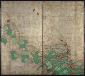 | Keywords: Natsu aki kusa-zu byobu 2.jpg LargeImage Artwork en Depicted is the left part of the pair of two-fold screens Summer and autumn flower plants showing an autumn scene plants swaying and red ivy leaves blown in a strong wind ja 酒井抱 の 屏風 風雨草花図 ( 称 夏秋草図屏風 左隻のみ) century 19 color silver undercoat Size cm 164 5 181 8 Institution Tokyo National Museum object history This piece was originally part of a two-sided folding screen with Ogata Kōrin's Wind God and Thunder God on one side and Sakai Hōitsu's Summer and autumn flower plants on the opposite side It was recently reformed into a pair of two-fold screens to protect it from damage in black ja by Hōitsu in red text surrounded by a red circle ja Bunsen was another name of Hōitsu Bunsen On the back of this screen is a painting of the Wind God by Ogata Kōrin accession number A-11189 http //www emuseum jp/detail/100321/002/004 word raijin d_lang en s_lang en class title c_e region era cptype owner pos 1 num 1 mode simple century Emuseum PD-old-100 thumb left right screen summer plants thumb reverse of this screen thumb reverse of the summer plants screen Sakai Hoitsu 19th-century paintings Rimpa school paintings Paintings of plants Paintings on screens from Japan Important Cultural Property of Japan in Tokyo Hedera in art Paintings of autumn |