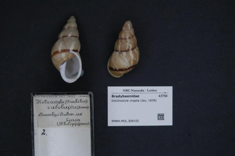 | Keywords: Naturalis Biodiversity Center - RMNH.MOL.309155 - Dolichostyla virgata (Jay, 1839) - Bradybaenidae - Mollusc shell.jpeg artwork Dimensions artwork Document type Bradybaenidae Dolichostyla Individual count Infraspecific epithet Infraspecific rank Institution Naturalis Kind of unit artwork Kind of unit specimen shell Life stage Medium artwork Nomenclatural code Source institute Rijksmuseum van Natuurlijke Historie Leiden Scale the width of the text on the species/QR-code label is 38 mm Occurrence ID page Other fields Other versions artwork Permission license Naturalis donation CC-0 Mollusca Publication location Scientific name Dolichostyla virgata Jay 1839 Scientific name authorship Jay 1839 Source url http //bioportal naturalis nl Specific epithet virgata State or province Subject keywords artwork Subject keywords publication Title artwork Title publication Type status Uploaded with GWToolset Naturalis_Biodiversity_Center_-_RMNH MOL 309155_-_Dolichostyla_virgata_ Jay _1839 _-_Bradybaenidae_-_Mollusc_shell http //medialib naturalis nl/file/id/RMNH MOL 309155/format/large Media donated by Naturalis Biodiversity Center Molluscs at Naturalis from the Rijksmuseum van Natuurlijke Historie Dolichostyla virgata Dolichostyla |