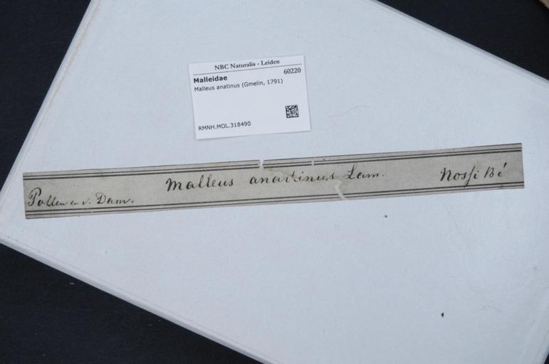 | Keywords: Naturalis Biodiversity Center - RMNH.MOL.318490 1 - Malleus anatinus (Gmelin, 1791) - Malleidae - Mollusc shell.jpeg artwork Dimensions artwork Document type Malleidae Malleus Individual count Infraspecific epithet Infraspecific rank Institution Naturalis Kind of unit artwork Kind of unit specimen shell Life stage Medium artwork Nomenclatural code Source institute Rijksmuseum van Natuurlijke Historie Leiden Scale the width of the text on the species/QR-code label is 38 mm Occurrence ID page Pterioida Other fields Other versions artwork Permission license Naturalis donation CC-0 Mollusca Publication location Scientific name Malleus anatinus Gmelin 1791 Scientific name authorship Gmelin 1791 Source url http //bioportal naturalis nl Specific epithet anatinus State or province Subject keywords artwork Subject keywords publication Title artwork Title publication Type status Uploaded with GWToolset Naturalis_Biodiversity_Center_-_RMNH MOL 318490_1_-_Malleus_anatinus_ Gmelin _1791 _-_Malleidae_-_Mollusc_shell http //medialib naturalis nl/file/id/RMNH MOL 318490_1/format/large Media donated by Naturalis Biodiversity Center Molluscs at Naturalis from the Rijksmuseum van Natuurlijke Historie Malleus anatinus Malleus genus |