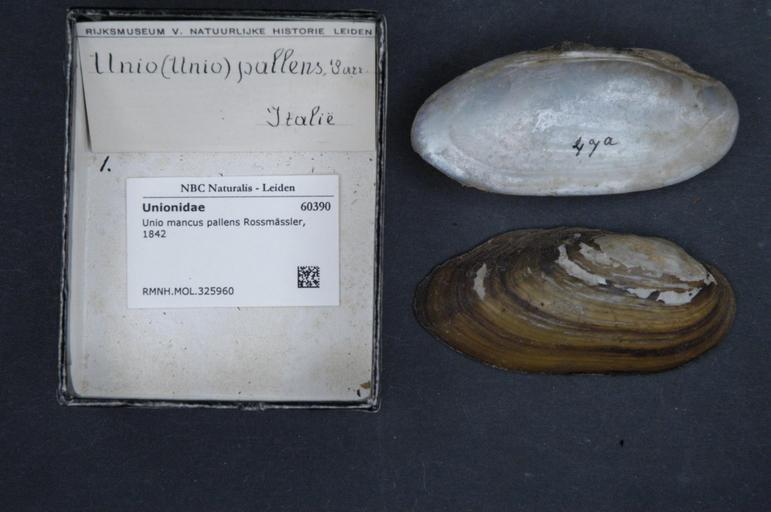 | Keywords: Naturalis Biodiversity Center - RMNH.MOL.325960 - Unio mancus pallens Rossmässler, 1842 - Unionidae - Mollusc shell.jpeg artwork Dimensions artwork Document type Unionidae subfamily Unioninae Unio Individual count Infraspecific epithet pallens Infraspecific rank Institution Naturalis Kind of unit artwork Kind of unit specimen shell Life stage Medium artwork Nomenclatural code Source institute Rijksmuseum van Natuurlijke Historie Leiden Scale the width of the text on the species/QR-code label is 38 mm Occurrence ID page Other fields Other versions artwork Permission license Naturalis donation CC-0 Mollusca Publication location Scientific name Unio mancus pallens Rossmässler 1842 Scientific name authorship Rossmässler 1842 Source url http //bioportal naturalis nl Specific epithet mancus State or province Subject keywords artwork Subject keywords publication Title artwork Title publication Type status Uploaded with GWToolset Naturalis_Biodiversity_Center_-_RMNH MOL 325960_-_Unio_mancus_pallens_Rossmässler _1842_-_Unionidae_-_Mollusc_shell http //medialib naturalis nl/file/id/RMNH MOL 325960/format/large Media donated by Naturalis Biodiversity Center Molluscs at Naturalis from the Rijksmuseum van Natuurlijke Historie Unio mancus Unio |