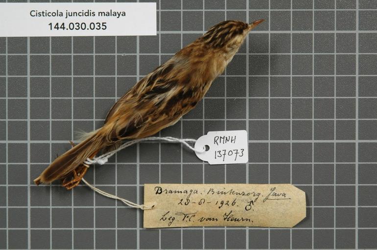 | Keywords: Naturalis Biodiversity Center - RMNH.AVES.137073 1 - Cisticola juncidis malaya Lynes, 1930 - Sylviidae - bird skin specimen.jpeg artwork Dimensions artwork Document type Sylviidae Cisticola Individual count 1 Infraspecific epithet malaya Infraspecific rank Institution Naturalis Kind of unit artwork Kind of unit specimen skin Life stage Indonesia Java Buitenzorg Dramaga Medium artwork Nomenclatural code Occurrence ID page Other fields Other versions artwork Permission license Naturalis donation CC-0 Publication location Scientific name Cisticola juncidis malaya Lynes 1930 Scientific name authorship Lynes 1930 male Source url http //bioportal naturalis nl Specific epithet juncidis State or province Subject keywords artwork Subject keywords publication Title artwork Title publication Type status Uploaded with GWToolset Naturalis_Biodiversity_Center_-_RMNH AVES 137073_1_-_Cisticola_juncidis_malaya_Lynes _1930_-_Sylviidae_-_bird_skin_specimen http //medialib naturalis nl/file/id/RMNH AVES 137073_1/format/large Media donated by Naturalis Biodiversity Center Songbird specimens at Naturalis Biodiversity Center Cisticola juncidis Cisticola |