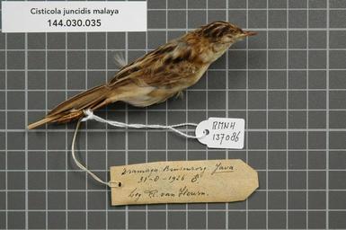 | Keywords: Naturalis Biodiversity Center - RMNH.AVES.137086 1 - Cisticola juncidis malaya Lynes, 1930 - Sylviidae - bird skin specimen.jpeg artwork Dimensions artwork Document type Sylviidae Cisticola Individual count 1 Infraspecific epithet malaya Infraspecific rank Institution Naturalis Kind of unit artwork Kind of unit specimen skin Life stage Indonesia Java Buitenzorg Dramaga Medium artwork Nomenclatural code Occurrence ID page Other fields Other versions artwork Permission license Naturalis donation CC-0 Publication location Scientific name Cisticola juncidis malaya Lynes 1930 Scientific name authorship Lynes 1930 male Source url http //bioportal naturalis nl Specific epithet juncidis State or province Subject keywords artwork Subject keywords publication Title artwork Title publication Type status Uploaded with GWToolset Naturalis_Biodiversity_Center_-_RMNH AVES 137086_1_-_Cisticola_juncidis_malaya_Lynes _1930_-_Sylviidae_-_bird_skin_specimen http //medialib naturalis nl/file/id/RMNH AVES 137086_1/format/large Media donated by Naturalis Biodiversity Center Songbird specimens at Naturalis Biodiversity Center Cisticola juncidis Cisticola |