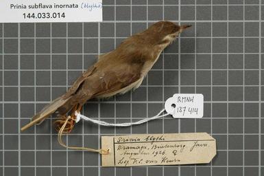| Keywords: Naturalis Biodiversity Center - RMNH.AVES.137414 1 - Prinia subflava inornata Sykes, 1832 - Sylviidae - bird skin specimen.jpeg artwork Dimensions artwork Document type Sylviidae Prinia Individual count 1 Infraspecific epithet inornata Infraspecific rank Institution Naturalis Kind of unit artwork Kind of unit specimen skin Life stage Indonesia Java Buitenzorg Dramaga Medium artwork Nomenclatural code Occurrence ID page Other fields Other versions artwork Permission license Naturalis donation CC-0 Publication location Scientific name Prinia subflava inornata Sykes 1832 Scientific name authorship Sykes 1832 female Source url http //bioportal naturalis nl Specific epithet subflava State or province Subject keywords artwork Subject keywords publication Title artwork Title publication Type status Uploaded with GWToolset Naturalis_Biodiversity_Center_-_RMNH AVES 137414_1_-_Prinia_subflava_inornata_Sykes _1832_-_Sylviidae_-_bird_skin_specimen http //medialib naturalis nl/file/id/RMNH AVES 137414_1/format/large Media donated by Naturalis Biodiversity Center Songbird specimens at Naturalis Biodiversity Center Prinia subflava Prinia |