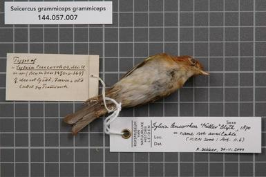 | Keywords: Naturalis Biodiversity Center - RMNH.AVES.138102 2 - Seicercus grammiceps grammiceps (Strickland, 1849) - Sylviidae - bird skin specimen.jpeg artwork Dimensions artwork Document type Sylviidae Seicercus Individual count 1 Infraspecific epithet grammiceps Infraspecific rank Institution Naturalis Kind of unit artwork Kind of unit specimen skin Life stage Indonesia W Java Mt Gede Medium artwork Nomenclatural code Check type Additional identification info Sylvia leucorrhoa Müller Blyth 1870 name not available ICZN 2000 Art 11 6 R Dekker 30 V 2001 Additional label info Type of Sylvia leucorrhos Müll n sp Blyth Ibis 1870 p 169 female Mount Gedé Java old label by Temminck Occurrence ID page Other fields Other versions artwork Permission license Naturalis donation CC-0 Publication location Scientific name Seicercus grammiceps grammiceps Strickland 1849 Scientific name authorship Strickland 1849 female Source url http //bioportal naturalis nl Specific epithet grammiceps State or province W Java Subject keywords artwork Subject keywords publication Title artwork Title publication Type status Uploaded with GWToolset Naturalis_Biodiversity_Center_-_RMNH AVES 138102_2_-_Seicercus_grammiceps_grammiceps_ Strickland _1849 _-_Sylviidae_-_bird_skin_specimen http //medialib naturalis nl/file/id/RMNH AVES 138102_2/format/large Media donated by Naturalis Biodiversity Center Songbird specimens at Naturalis Biodiversity Center Seicercus grammiceps |