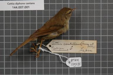 | Keywords: Naturalis Biodiversity Center - RMNH.AVES.139475 1 - Cettia diphone cantans (Temminck and Schlegel, 1847) - Sylviidae - bird skin specimen.jpeg artwork Dimensions artwork Document type Sylviidae Cettia Individual count 1 Infraspecific epithet cantans Infraspecific rank Institution Naturalis Kind of unit artwork Kind of unit specimen skin Life stage Japan Medium artwork Nomenclatural code Occurrence ID page Other fields Other versions artwork Permission license Naturalis donation CC-0 Publication location Scientific name Cettia diphone cantans Temminck and Schlegel 1847 Scientific name authorship Temminck and Schlegel 1847 male Source url http //bioportal naturalis nl Specific epithet diphone State or province Subject keywords artwork Subject keywords publication Title artwork Title publication Type status Uploaded with GWToolset Naturalis_Biodiversity_Center_-_RMNH AVES 139475_1_-_Cettia_diphone_cantans_ Temminck_and_Schlegel _1847 _-_Sylviidae_-_bird_skin_specimen http //medialib naturalis nl/file/id/RMNH AVES 139475_1/format/large Media donated by Naturalis Biodiversity Center Songbird specimens at Naturalis Biodiversity Center Horornis diphone Cettia |