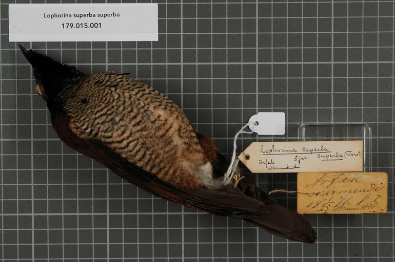 | Keywords: Naturalis Biodiversity Center - RMNH.AVES.140802 1 - Lophorina superba superba (Pennant, 1781) - Paradisaeidae - bird skin specimen.jpeg artwork Dimensions artwork Document type Paradisaeidae Lophorina Individual count 1 Infraspecific epithet superba Infraspecific rank Institution Naturalis Kind of unit artwork Kind of unit specimen skin Life stage juvenile Arfak Warmendi Medium artwork Nomenclatural code Additional info l Occurrence ID page Other fields Other versions artwork Permission license Naturalis donation CC-0 Publication location Scientific name Lophorina superba superba Pennant 1781 Scientific name authorship Pennant 1781 male Source url http //bioportal naturalis nl Specific epithet superba State or province Arfak Subject keywords artwork Subject keywords publication Title artwork Title publication Type status Uploaded with GWToolset Naturalis_Biodiversity_Center_-_RMNH AVES 140802_1_-_Lophorina_superba_superba_ Pennant _1781 _-_Paradisaeidae_-_bird_skin_specimen http //medialib naturalis nl/file/id/RMNH AVES 140802_1/format/large Media donated by Naturalis Biodiversity Center Songbird specimens at Naturalis Biodiversity Center Lophorina superba Lophorina |