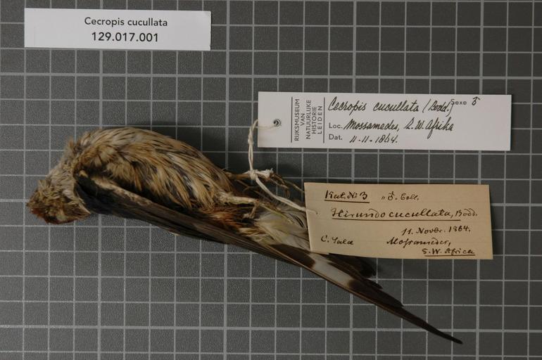 | Keywords: Naturalis Biodiversity Center - RMNH.AVES.125121 1 - Cecropis cucullata (Boddaert, 1783) - Hirundinidae - bird skin specimen.jpeg artwork Dimensions artwork Document type Hirundinidae Cecropis Individual count 1 Infraspecific epithet Infraspecific rank Institution Naturalis Kind of unit artwork Kind of unit specimen skin Life stage Z W Afrika Mossamedes Medium artwork Nomenclatural code Additional identification info NB War unbestimmt Sex remark male Coll Occurrence ID page Other fields Other versions artwork Permission license Naturalis donation CC-0 Publication location Scientific name Cecropis cucullata Boddaert 1783 Scientific name authorship Boddaert 1783 male Source url http //bioportal naturalis nl Specific epithet cucullata State or province Subject keywords artwork Subject keywords publication Title artwork Title publication Type status Uploaded with GWToolset Naturalis_Biodiversity_Center_-_RMNH AVES 125121_1_-_Cecropis_cucullata_ Boddaert _1783 _-_Hirundinidae_-_bird_skin_specimen http //medialib naturalis nl/file/id/RMNH AVES 125121_1/format/large Media donated by Naturalis Biodiversity Center Songbird specimens at Naturalis Biodiversity Center Cecropis cucullata museum specimens |