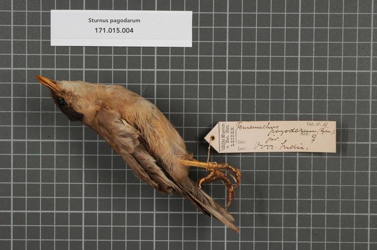| Keywords: Naturalis Biodiversity Center - RMNH.AVES.144329 1 - Sturnus pagodarum (J.F. Gmelin, 1789) - Sturnidae - bird skin specimen.jpeg artwork Dimensions artwork Document type Sturnidae Sturnus Individual count 1 Infraspecific epithet Infraspecific rank Institution Naturalis Kind of unit artwork Kind of unit specimen skin Life stage juvenile Voor-Indie Medium artwork Nomenclatural code Occurrence ID page Other fields Other versions artwork Permission license Naturalis donation CC-0 Publication location Scientific name Sturnus pagodarum J F Gmelin 1789 Scientific name authorship J F Gmelin 1789 female Source url http //bioportal naturalis nl Specific epithet pagodarum State or province Voor-Indie Subject keywords artwork Subject keywords publication Title artwork Title publication Type status Uploaded with GWToolset Naturalis_Biodiversity_Center_-_RMNH AVES 144329_1_-_Sturnus_pagodarum_ J F _Gmelin _1789 _-_Sturnidae_-_bird_skin_specimen http //medialib naturalis nl/file/id/RMNH AVES 144329_1/format/large Media donated by Naturalis Biodiversity Center Songbird specimens at Naturalis Biodiversity Center Sturnia pagodarum |
