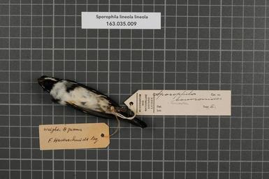 | Keywords: Naturalis Biodiversity Center - RMNH.AVES.14688 2 - Sporophila lineola lineola (Linnaeus, 1758) - Emberizidae - bird skin specimen.jpeg artwork Dimensions artwork Document type Emberizidae Sporophila Individual count 1 Infraspecific epithet lineola Infraspecific rank Institution Naturalis Kind of unit artwork Kind of unit specimen skin Life stage Surinam Surinamriver Plantation Peperpot Medium artwork Nomenclatural code Occurrence ID page Other fields Other versions artwork Permission license Naturalis donation CC-0 Publication location Scientific name Sporophila lineola lineola Linnaeus 1758 Scientific name authorship Linnaeus 1758 male Source url http //bioportal naturalis nl Specific epithet lineola State or province Subject keywords artwork Subject keywords publication Title artwork Title publication Type status Uploaded with GWToolset Naturalis_Biodiversity_Center_-_RMNH AVES 14688_2_-_Sporophila_lineola_lineola_ Linnaeus _1758 _-_Emberizidae_-_bird_skin_specimen http //medialib naturalis nl/file/id/RMNH AVES 14688_2/format/large Media donated by Naturalis Biodiversity Center Songbird specimens at Naturalis Biodiversity Center Sporophila Sporophila lineola |