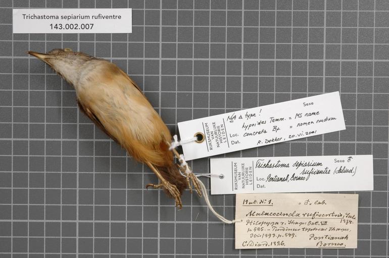 Keywords: Naturalis Biodiversity Center - RMNH.AVES.147063 1 - Trichastoma sepiarium rufiventre (Salvadori, 1874) - Timaliidae - bird skin specimen.jpeg artwork Dimensions artwork Document type Timaliidae Trichastoma Individual count 1 Infraspecific epithet rufiventre Infraspecific rank Institution Naturalis Kind of unit artwork Kind of unit specimen skin Life stage Indonesia Borneo Pontianak Medium artwork Nomenclatural code Check type ADDITIONAL identification info hypoides Temm MS name concreta Bp nomen nudum R Dekker 20 VI 2001 Sex remark On original label male lab Occurrence ID page Other fields Other versions artwork Permission license Naturalis donation CC-0 Publication location Scientific name Trichastoma sepiarium rufiventre Salvadori 1874 Scientific name authorship Salvadori 1874 male Source url http //bioportal naturalis nl Specific epithet sepiarium State or province Subject keywords artwork Subject keywords publication Title artwork Title publication Type status Uploaded with GWToolset Naturalis_Biodiversity_Center_-_RMNH AVES 147063_1_-_Trichastoma_sepiarium_rufiventre_ Salvadori _1874 _-_Timaliidae_-_bird_skin_specimen http //medialib naturalis nl/file/id/RMNH AVES 147063_1/format/large Media donated by Naturalis Biodiversity Center Songbird specimens at Naturalis Biodiversity Center Trichastoma Trichastoma sepiarium |