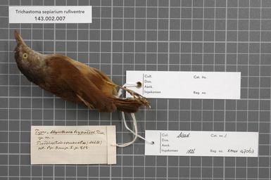| Keywords: Naturalis Biodiversity Center - RMNH.AVES.147063 2 - Trichastoma sepiarium rufiventre (Salvadori, 1874) - Timaliidae - bird skin specimen.jpeg artwork Dimensions artwork Document type Timaliidae Trichastoma Individual count 1 Infraspecific epithet rufiventre Infraspecific rank Institution Naturalis Kind of unit artwork Kind of unit specimen skin Life stage Indonesia Borneo Pontianak Medium artwork Nomenclatural code Check type ADDITIONAL identification info hypoides Temm MS name concreta Bp nomen nudum R Dekker 20 VI 2001 Sex remark On original label male lab Occurrence ID page Other fields Other versions artwork Permission license Naturalis donation CC-0 Publication location Scientific name Trichastoma sepiarium rufiventre Salvadori 1874 Scientific name authorship Salvadori 1874 male Source url http //bioportal naturalis nl Specific epithet sepiarium State or province Subject keywords artwork Subject keywords publication Title artwork Title publication Type status Uploaded with GWToolset Naturalis_Biodiversity_Center_-_RMNH AVES 147063_2_-_Trichastoma_sepiarium_rufiventre_ Salvadori _1874 _-_Timaliidae_-_bird_skin_specimen http //medialib naturalis nl/file/id/RMNH AVES 147063_2/format/large Media donated by Naturalis Biodiversity Center Songbird specimens at Naturalis Biodiversity Center Trichastoma Trichastoma sepiarium |