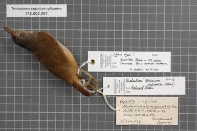 | Keywords: Naturalis Biodiversity Center - RMNH.AVES.147064 1 - Trichastoma sepiarium rufiventre (Salvadori, 1874) - Timaliidae - bird skin specimen.jpeg artwork Dimensions artwork Document type Timaliidae Trichastoma Individual count 1 Infraspecific epithet rufiventre Infraspecific rank Institution Naturalis Kind of unit artwork Kind of unit specimen skin Life stage Indonesia Borneo Pontianak Medium artwork Nomenclatural code Check type ADDITIONAL identification info hypoides Temm MS name concreta Bp nomen nudum R Dekker 20 VI 2001 Sex remark On original label female lab Occurrence ID page Other fields Other versions artwork Permission license Naturalis donation CC-0 Publication location Scientific name Trichastoma sepiarium rufiventre Salvadori 1874 Scientific name authorship Salvadori 1874 female Source url http //bioportal naturalis nl Specific epithet sepiarium State or province Subject keywords artwork Subject keywords publication Title artwork Title publication Type status Uploaded with GWToolset Naturalis_Biodiversity_Center_-_RMNH AVES 147064_1_-_Trichastoma_sepiarium_rufiventre_ Salvadori _1874 _-_Timaliidae_-_bird_skin_specimen http //medialib naturalis nl/file/id/RMNH AVES 147064_1/format/large Media donated by Naturalis Biodiversity Center Songbird specimens at Naturalis Biodiversity Center Trichastoma Trichastoma sepiarium |