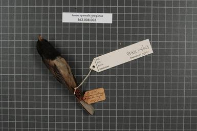 | Keywords: Naturalis Biodiversity Center - RMNH.AVES.149643 1 - Presco hyemalis oreganus (Townsend, 1837) - Emberizidae - bird skin specimen.jpeg artwork Dimensions artwork Document type Emberizidae Junco Individual count 1 Infraspecific epithet oreganus Infraspecific rank Institution Naturalis Kind of unit artwork Kind of unit specimen skin Life stage Californien Lassen County Big Val Medium artwork Nomenclatural code Occurrence ID page Other fields Other versions artwork Permission license Naturalis donation CC-0 Publication location Scientific name Presco hyemalis oreganus Townsend 1837 Scientific name authorship Townsend 1837 male Source url http //bioportal naturalis nl Specific epithet hyemalis State or province Californien Lassen County Subject keywords artwork Subject keywords publication Title artwork Title publication Type status Uploaded with GWToolset Naturalis_Biodiversity_Center_-_RMNH AVES 149643_1_-_Presco_hyemalis_oreganus_ Townsend _1837 _-_Emberizidae_-_bird_skin_specimen http //medialib naturalis nl/file/id/RMNH AVES 149643_1/format/large Media donated by Naturalis Biodiversity Center Songbird specimens at Naturalis Biodiversity Center Junco Junco hyemalis |
