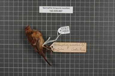 | Keywords: Naturalis Biodiversity Center - RMNH.AVES.149876 1 - Presrophila torqueola morelleti (Bonaparte, 1851) - Emberizidae - bird skin specimen.jpeg artwork Dimensions artwork Document type Emberizidae Sporophila Individual count 1 Infraspecific epithet morelleti Infraspecific rank Institution Naturalis Kind of unit artwork Kind of unit specimen skin Life stage Costa Rica Medium artwork Nomenclatural code Occurrence ID page Other fields Other versions artwork Permission license Naturalis donation CC-0 Publication location Scientific name Presrophila torqueola morelleti Bonaparte 1851 Scientific name authorship Bonaparte 1851 female Source url http //bioportal naturalis nl Specific epithet torqueola State or province Subject keywords artwork Subject keywords publication Title artwork Title publication Type status Uploaded with GWToolset Naturalis_Biodiversity_Center_-_RMNH AVES 149876_1_-_Presrophila_torqueola_morelleti_ Bonaparte _1851 _-_Emberizidae_-_bird_skin_specimen http //medialib naturalis nl/file/id/RMNH AVES 149876_1/format/large Media donated by Naturalis Biodiversity Center Songbird specimens at Naturalis Biodiversity Center Sporophila Sporophila torqueola |