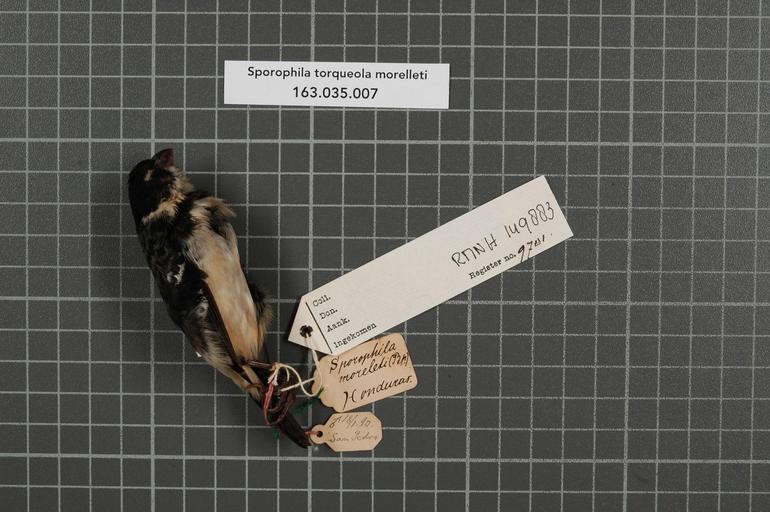 | Keywords: Naturalis Biodiversity Center - RMNH.AVES.149883 1 - Presrophila torqueola morelleti (Bonaparte, 1851) - Emberizidae - bird skin specimen.jpeg artwork Dimensions artwork Document type Emberizidae Sporophila Individual count 1 Infraspecific epithet morelleti Infraspecific rank Institution Naturalis Kind of unit artwork Kind of unit specimen skin Life stage Honduras San Pedro Medium artwork Nomenclatural code Occurrence ID page Other fields Other versions artwork Permission license Naturalis donation CC-0 Publication location Scientific name Presrophila torqueola morelleti Bonaparte 1851 Scientific name authorship Bonaparte 1851 male Source url http //bioportal naturalis nl Specific epithet torqueola State or province Subject keywords artwork Subject keywords publication Title artwork Title publication Type status Uploaded with GWToolset Naturalis_Biodiversity_Center_-_RMNH AVES 149883_1_-_Presrophila_torqueola_morelleti_ Bonaparte _1851 _-_Emberizidae_-_bird_skin_specimen http //medialib naturalis nl/file/id/RMNH AVES 149883_1/format/large Media donated by Naturalis Biodiversity Center Songbird specimens at Naturalis Biodiversity Center Sporophila Sporophila torqueola |