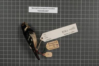 | Keywords: Naturalis Biodiversity Center - RMNH.AVES.149886 1 - Presrophila torqueola morelleti (Bonaparte, 1851) - Emberizidae - bird skin specimen.jpeg artwork Dimensions artwork Document type Emberizidae Sporophila Individual count 1 Infraspecific epithet morelleti Infraspecific rank Institution Naturalis Kind of unit artwork Kind of unit specimen skin Life stage juvenile Honduras Medium artwork Nomenclatural code Age remark on label juv whipped out Occurrence ID page Other fields Other versions artwork Permission license Naturalis donation CC-0 Publication location Scientific name Presrophila torqueola morelleti Bonaparte 1851 Scientific name authorship Bonaparte 1851 Source url http //bioportal naturalis nl Specific epithet torqueola State or province Subject keywords artwork Subject keywords publication Title artwork Title publication Type status Uploaded with GWToolset Naturalis_Biodiversity_Center_-_RMNH AVES 149886_1_-_Presrophila_torqueola_morelleti_ Bonaparte _1851 _-_Emberizidae_-_bird_skin_specimen http //medialib naturalis nl/file/id/RMNH AVES 149886_1/format/large Media donated by Naturalis Biodiversity Center Songbird specimens at Naturalis Biodiversity Center Sporophila Sporophila torqueola |