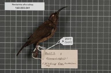 | Keywords: Naturalis Biodiversity Center - RMNH.AVES.150562 1 - Prestarinia afra subsp. - Nectariniidae - bird skin specimen.jpeg artwork Dimensions artwork Document type Nectariniidae Nectarinia Individual count 1 Infraspecific epithet subsp Infraspecific rank Institution Naturalis Kind of unit artwork Kind of unit specimen skin Life stage Cap Swellendam Medium artwork Nomenclatural code Occurrence ID page Other fields Other versions artwork Permission license Naturalis donation CC-0 Publication location Scientific name Prestarinia afra subsp Scientific name authorship female Source url http //bioportal naturalis nl Specific epithet afra State or province Cap Subject keywords artwork Subject keywords publication Title artwork Title publication Type status Uploaded with GWToolset Naturalis_Biodiversity_Center_-_RMNH AVES 150562_1_-_Prestarinia_afra_subsp _-_Nectariniidae_-_bird_skin_specimen http //medialib naturalis nl/file/id/RMNH AVES 150562_1/format/large Media donated by Naturalis Biodiversity Center Songbird specimens at Naturalis Biodiversity Center Nectarinia Cinnyris afer |