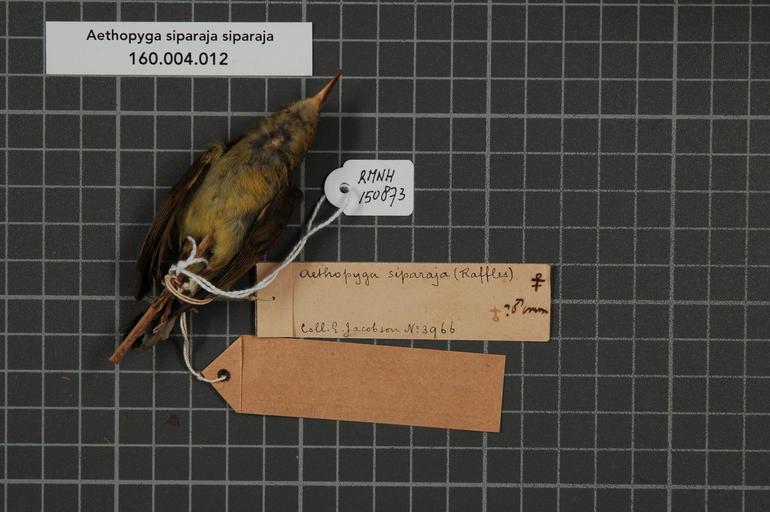 | Keywords: Naturalis Biodiversity Center - RMNH.AVES.150873 2 - Aethopyga siparaja siparaja (Raffles, 1822) - Nectariniidae - bird skin specimen.jpeg artwork Dimensions artwork Document type Nectariniidae Aethopyga Individual count 1 Infraspecific epithet siparaja Infraspecific rank Institution Naturalis Kind of unit artwork Kind of unit specimen skin Life stage Indonesia Sumatra Pad Bovenlanden Fort de Kock Medium artwork Nomenclatural code Sex remark On original label female male imm Occurrence ID page Other fields Other versions artwork Permission license Naturalis donation CC-0 Publication location Scientific name Aethopyga siparaja siparaja Raffles 1822 Scientific name authorship Raffles 1822 Source url http //bioportal naturalis nl Specific epithet siparaja State or province Sumatra Pad Bovenlanden Subject keywords artwork Subject keywords publication Title artwork Title publication Type status Uploaded with GWToolset Naturalis_Biodiversity_Center_-_RMNH AVES 150873_2_-_Aethopyga_siparaja_siparaja_ Raffles _1822 _-_Nectariniidae_-_bird_skin_specimen http //medialib naturalis nl/file/id/RMNH AVES 150873_2/format/large Media donated by Naturalis Biodiversity Center Songbird specimens at Naturalis Biodiversity Center Aethopyga Aethopyga siparaja |
