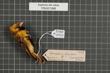 | Keywords: Naturalis Biodiversity Center - RMNH.AVES.151577 1 - Euplectes afer subsp. - Ploceidae - bird skin specimen.jpeg artwork Dimensions artwork Document type Ploceidae Euplectes Individual count 1 Infraspecific epithet subsp Infraspecific rank Institution Naturalis Kind of unit artwork Kind of unit specimen skin Life stage Medium artwork Nomenclatural code Occurrence ID page Other fields Other versions artwork Permission license Naturalis donation CC-0 Publication location Scientific name Euplectes afer subsp Scientific name authorship male Source url http //bioportal naturalis nl Specific epithet afer State or province Subject keywords artwork Subject keywords publication Title artwork Title publication Type status Uploaded with GWToolset Naturalis_Biodiversity_Center_-_RMNH AVES 151577_1_-_Euplectes_afer_subsp _-_Ploceidae_-_bird_skin_specimen http //medialib naturalis nl/file/id/RMNH AVES 151577_1/format/large Media donated by Naturalis Biodiversity Center Songbird specimens at Naturalis Biodiversity Center Euplectes afer Euplectes |