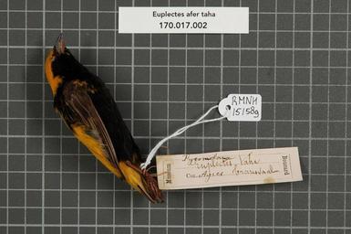| Keywords: Naturalis Biodiversity Center - RMNH.AVES.151589 1 - Euplectes afer taha A. Smith, 1836 - Ploceidae - bird skin specimen.jpeg artwork Dimensions artwork Document type Ploceidae Euplectes Individual count 1 Infraspecific epithet taha Infraspecific rank Institution Naturalis Kind of unit artwork Kind of unit specimen skin Life stage Transvaal Ayres Medium artwork Nomenclatural code Occurrence ID page Other fields Other versions artwork Permission license Naturalis donation CC-0 Publication location Scientific name Euplectes afer taha A Smith 1836 Scientific name authorship A Smith 1836 Source url http //bioportal naturalis nl Specific epithet afer State or province Transvaal Subject keywords artwork Subject keywords publication Title artwork Title publication Type status Uploaded with GWToolset Naturalis_Biodiversity_Center_-_RMNH AVES 151589_1_-_Euplectes_afer_taha_A _Smith _1836_-_Ploceidae_-_bird_skin_specimen http //medialib naturalis nl/file/id/RMNH AVES 151589_1/format/large Media donated by Naturalis Biodiversity Center Songbird specimens at Naturalis Biodiversity Center Euplectes afer Euplectes |