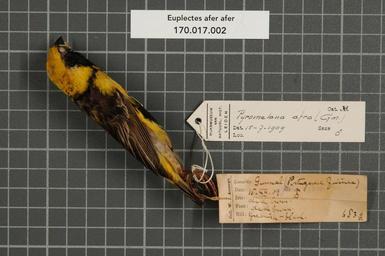 | Keywords: Naturalis Biodiversity Center - RMNH.AVES.151587 1 - Euplectes afer afer Gmelin, 1789 - Ploceidae - bird skin specimen.jpeg artwork Dimensions artwork Document type Ploceidae Euplectes Individual count 1 Infraspecific epithet afer Infraspecific rank Institution Naturalis Kind of unit artwork Kind of unit specimen skin Life stage Portuguese Guinéa Gunnal Medium artwork Nomenclatural code Occurrence ID page Other fields Other versions artwork Permission license Naturalis donation CC-0 Publication location Scientific name Euplectes afer afer Gmelin 1789 Scientific name authorship Gmelin 1789 male Source url http //bioportal naturalis nl Specific epithet afer State or province Subject keywords artwork Subject keywords publication Title artwork Title publication Type status Uploaded with GWToolset Naturalis_Biodiversity_Center_-_RMNH AVES 151587_1_-_Euplectes_afer_afer_Gmelin _1789_-_Ploceidae_-_bird_skin_specimen http //medialib naturalis nl/file/id/RMNH AVES 151587_1/format/large Media donated by Naturalis Biodiversity Center Songbird specimens at Naturalis Biodiversity Center Euplectes afer Euplectes |
