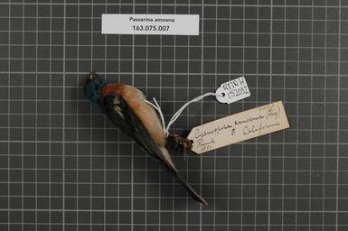| Keywords: Naturalis Biodiversity Center - RMNH.AVES.152032 1 - Passerina amoena (Say, 1823) - Emberizidae - bird skin specimen.jpeg artwork Dimensions artwork Document type Emberizidae Passerina Individual count 1 Infraspecific epithet Infraspecific rank Institution Naturalis Kind of unit artwork Kind of unit specimen skin Life stage Californie Medium artwork Nomenclatural code Occurrence ID page Other fields Other versions artwork Permission license Naturalis donation CC-0 Publication location Scientific name Passerina amoena Say 1823 Scientific name authorship Say 1823 male Source url http //bioportal naturalis nl Specific epithet amoena State or province Californie Subject keywords artwork Subject keywords publication Title artwork Title publication Type status Uploaded with GWToolset Naturalis_Biodiversity_Center_-_RMNH AVES 152032_1_-_Passerina_amoena_ Say _1823 _-_Emberizidae_-_bird_skin_specimen http //medialib naturalis nl/file/id/RMNH AVES 152032_1/format/large Media donated by Naturalis Biodiversity Center Songbird specimens at Naturalis Biodiversity Center Passerina amoena Passerina |