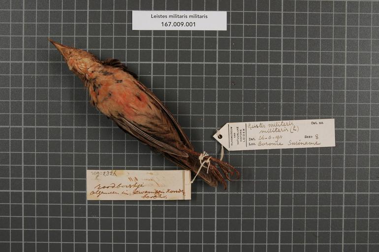| Keywords: Naturalis Biodiversity Center - RMNH.AVES.153537 2 - Leistes militaris militaris (Linnaeus, 1758) - Icteridae - bird skin specimen.jpeg artwork Dimensions artwork Document type Icteridae Leistes Individual count 1 Infraspecific epithet militaris Infraspecific rank Institution Naturalis Kind of unit artwork Kind of unit specimen skin Life stage Suriname Coronie Medium artwork Nomenclatural code Occurrence ID page Other fields Other versions artwork Permission license Naturalis donation CC-0 Publication location Scientific name Leistes militaris militaris Linnaeus 1758 Scientific name authorship Linnaeus 1758 female Source url http //bioportal naturalis nl Specific epithet militaris State or province Coronie Subject keywords artwork Subject keywords publication Title artwork Title publication Type status Uploaded with GWToolset Naturalis_Biodiversity_Center_-_RMNH AVES 153537_2_-_Leistes_militaris_militaris_ Linnaeus _1758 _-_Icteridae_-_bird_skin_specimen http //medialib naturalis nl/file/id/RMNH AVES 153537_2/format/large Media donated by Naturalis Biodiversity Center Songbird specimens at Naturalis Biodiversity Center Sturnella militaris |