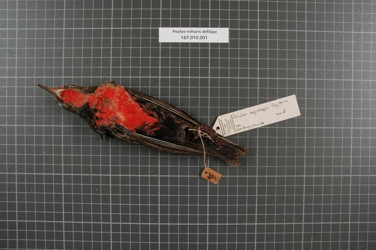| Keywords: Naturalis Biodiversity Center - RMNH.AVES.153548 2 - Pezites militaris defilippi (Bonaparte, 1851) - Icteridae - bird skin specimen.jpeg artwork Dimensions artwork Document type Icteridae Pezites Individual count 1 Infraspecific epithet defilippi Infraspecific rank Institution Naturalis Kind of unit artwork Kind of unit specimen skin Life stage Argentinie Medium artwork Nomenclatural code Occurrence ID page Other fields Other versions artwork Permission license Naturalis donation CC-0 Publication location Scientific name Pezites militaris defilippi Bonaparte 1851 Scientific name authorship Bonaparte 1851 male Source url http //bioportal naturalis nl Specific epithet militaris State or province Subject keywords artwork Subject keywords publication Title artwork Title publication Type status Uploaded with GWToolset Naturalis_Biodiversity_Center_-_RMNH AVES 153548_2_-_Pezites_militaris_defilippi_ Bonaparte _1851 _-_Icteridae_-_bird_skin_specimen http //medialib naturalis nl/file/id/RMNH AVES 153548_2/format/large Media donated by Naturalis Biodiversity Center Songbird specimens at Naturalis Biodiversity Center Pezites militaris Pezites |