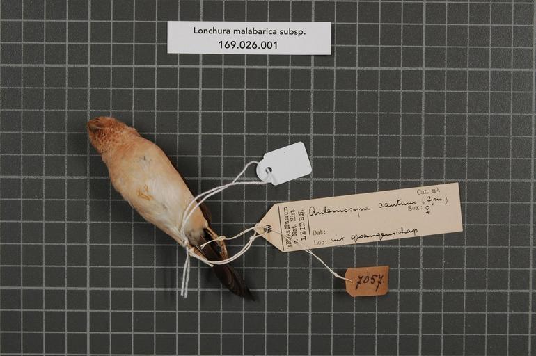 | Keywords: Naturalis Biodiversity Center - RMNH.AVES.160818 2 - Lonchura malabarica cantans (Gmelin, 1789) - Estrildidae - bird skin specimen.jpeg artwork Dimensions artwork Document type Estrildidae Lonchura Individual count 1 Infraspecific epithet cantans Infraspecific rank Institution Naturalis Kind of unit artwork Kind of unit specimen skin Life stage Medium artwork Nomenclatural code Occurrence ID page Other fields Other versions artwork Permission license Naturalis donation CC-0 Publication location Scientific name Lonchura malabarica cantans Gmelin 1789 Scientific name authorship Gmelin 1789 female Source url http //bioportal naturalis nl Specific epithet malabarica State or province Subject keywords artwork Subject keywords publication Title artwork Title publication Type status Uploaded with GWToolset Naturalis_Biodiversity_Center_-_RMNH AVES 160818_2_-_Lonchura_malabarica_cantans_ Gmelin _1789 _-_Estrildidae_-_bird_skin_specimen http //medialib naturalis nl/file/id/RMNH AVES 160818_2/format/large Media donated by Naturalis Biodiversity Center Songbird specimens at Naturalis Biodiversity Center Euodice malabarica Lonchura |