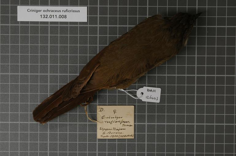 | Keywords: Naturalis Biodiversity Center - RMNH.AVES.126403 1 - Criniger ochraceus ruficrissus Sharpe, 1879 - Pycnonotidae - bird skin specimen.jpeg artwork Dimensions artwork Document type Pycnonotidae Criniger Individual count 1 Infraspecific epithet ruficrissus Infraspecific rank Institution Naturalis Kind of unit artwork Kind of unit specimen skin Life stage Indonesia C Borneo Upper Kajan Medium artwork Nomenclatural code Additional info AF Additional info remark comment recorder F probably is symbol not letter F Occurrence ID page Other fields Other versions artwork Permission license Naturalis donation CC-0 Publication location Scientific name Criniger ochraceus ruficrissus Sharpe 1879 Scientific name authorship Sharpe 1879 female Source url http //bioportal naturalis nl Specific epithet ochraceus State or province C Borneo Subject keywords artwork Subject keywords publication Title artwork Title publication Type status Uploaded with GWToolset Naturalis_Biodiversity_Center_-_RMNH AVES 126403_1_-_Criniger_ochraceus_ruficrissus_Sharpe _1879_-_Pycnonotidae_-_bird_skin_specimen http //medialib naturalis nl/file/id/RMNH AVES 126403_1/format/large Media donated by Naturalis Biodiversity Center Songbird specimens at Naturalis Biodiversity Center Criniger ochraceus |