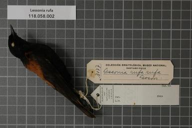 | Keywords: Naturalis Biodiversity Center - RMNH.AVES.20381 1 - Lessonia rufa (Gmelin, 1789) - Tyrannidae - bird skin specimen.jpeg artwork Dimensions artwork Document type Tyrannidae Lessonia Individual count 1 Infraspecific epithet Infraspecific rank Institution Naturalis Kind of unit artwork Kind of unit specimen skin Life stage adult Tierra del Fuego Ekewern Medium artwork Nomenclatural code Occurrence ID page Other fields Other versions artwork Permission license Naturalis donation CC-0 Publication location Scientific name Lessonia rufa Gmelin 1789 Scientific name authorship Gmelin 1789 male Source url http //bioportal naturalis nl Specific epithet rufa State or province Tierra del Fuego Subject keywords artwork Subject keywords publication Title artwork Title publication Type status Uploaded with GWToolset Naturalis_Biodiversity_Center_-_RMNH AVES 20381_1_-_Lessonia_rufa_ Gmelin _1789 _-_Tyrannidae_-_bird_skin_specimen http //medialib naturalis nl/file/id/RMNH AVES 20381_1/format/large Media donated by Naturalis Biodiversity Center Songbird specimens at Naturalis Biodiversity Center Lessonia rufa Lessonia |