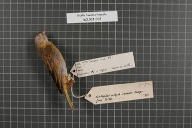 | Keywords: Naturalis Biodiversity Center - RMNH.AVES.21322 1 - Sicalis flaveola flaveola (Linnaeus, 1766) - Emberizidae - bird skin specimen.jpeg artwork Dimensions artwork Document type Emberizidae Sicalis Individual count 1 Infraspecific epithet flaveola Infraspecific rank Institution Naturalis Kind of unit artwork Kind of unit specimen skin Life stage juvenile Trinidad Tacarigua bamboerand oostzijde savanne Orange Grove Estate Medium artwork Nomenclatural code Age remark on label Mees juv Occurrence ID page Other fields Other versions artwork Permission license Naturalis donation CC-0 Publication location Scientific name Sicalis flaveola flaveola Linnaeus 1766 Scientific name authorship Linnaeus 1766 male Source url http //bioportal naturalis nl Specific epithet flaveola State or province Tacarigua Subject keywords artwork Subject keywords publication Title artwork Title publication Type status Uploaded with GWToolset Naturalis_Biodiversity_Center_-_RMNH AVES 21322_1_-_Sicalis_flaveola_flaveola_ Linnaeus _1766 _-_Emberizidae_-_bird_skin_specimen http //medialib naturalis nl/file/id/RMNH AVES 21322_1/format/large Media donated by Naturalis Biodiversity Center Songbird specimens at Naturalis Biodiversity Center Sicalis flaveola Sicalis |