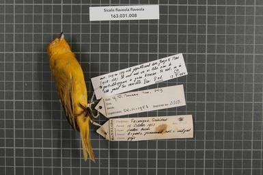 | Keywords: Naturalis Biodiversity Center - RMNH.AVES.21358 1 - Sicalis flaveola flaveola (Linnaeus, 1766) - Emberizidae - bird skin specimen.jpeg artwork Dimensions artwork Document type Emberizidae Sicalis Individual count 1 Infraspecific epithet flaveola Infraspecific rank Institution Naturalis Kind of unit artwork Kind of unit specimen skin Life stage adult Trinidad Tacarigua Savanna Orange Grove Estate Medium artwork Nomenclatural code Sex remark on label van deze vogel heeft de preparateur Cosse mij destijds zelf laten zien dat het geslacht f male Was met goed ontwikkeld ovarium en niet zoals ik op het etiket had geschreven male zo zijn de nrs 349 en 579 ook gepubliceerd door Junge and Mees 1958 168 Ik weet niet wie er later aan de geslachtsopgave is gaan knoeien Ik niet en in elk geval ten onrechte Dus f male ad GM 13 II 1984 Occurrence ID page Other fields Other versions artwork Permission license Naturalis donation CC-0 Publication location Scientific name Sicalis flaveola flaveola Linnaeus 1766 Scientific name authorship Linnaeus 1766 female Source url http //bioportal naturalis nl Specific epithet flaveola State or province Tacarigua Subject keywords artwork Subject keywords publication Title artwork Title publication Type status Uploaded with GWToolset Naturalis_Biodiversity_Center_-_RMNH AVES 21358_1_-_Sicalis_flaveola_flaveola_ Linnaeus _1766 _-_Emberizidae_-_bird_skin_specimen http //medialib naturalis nl/file/id/RMNH AVES 21358_1/format/large Media donated by Naturalis Biodiversity Center Songbird specimens at Naturalis Biodiversity Center Sicalis flaveola Sicalis |