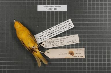 | Keywords: Naturalis Biodiversity Center - RMNH.AVES.21358 2 - Sicalis flaveola flaveola (Linnaeus, 1766) - Emberizidae - bird skin specimen.jpeg artwork Dimensions artwork Document type Emberizidae Sicalis Individual count 1 Infraspecific epithet flaveola Infraspecific rank Institution Naturalis Kind of unit artwork Kind of unit specimen skin Life stage adult Trinidad Tacarigua Savanna Orange Grove Estate Medium artwork Nomenclatural code Sex remark on label van deze vogel heeft de preparateur Cosse mij destijds zelf laten zien dat het geslacht f male Was met goed ontwikkeld ovarium en niet zoals ik op het etiket had geschreven male zo zijn de nrs 349 en 579 ook gepubliceerd door Junge and Mees 1958 168 Ik weet niet wie er later aan de geslachtsopgave is gaan knoeien Ik niet en in elk geval ten onrechte Dus f male ad GM 13 II 1984 Occurrence ID page Other fields Other versions artwork Permission license Naturalis donation CC-0 Publication location Scientific name Sicalis flaveola flaveola Linnaeus 1766 Scientific name authorship Linnaeus 1766 female Source url http //bioportal naturalis nl Specific epithet flaveola State or province Tacarigua Subject keywords artwork Subject keywords publication Title artwork Title publication Type status Uploaded with GWToolset Naturalis_Biodiversity_Center_-_RMNH AVES 21358_2_-_Sicalis_flaveola_flaveola_ Linnaeus _1766 _-_Emberizidae_-_bird_skin_specimen http //medialib naturalis nl/file/id/RMNH AVES 21358_2/format/large Media donated by Naturalis Biodiversity Center Songbird specimens at Naturalis Biodiversity Center Sicalis flaveola Sicalis |