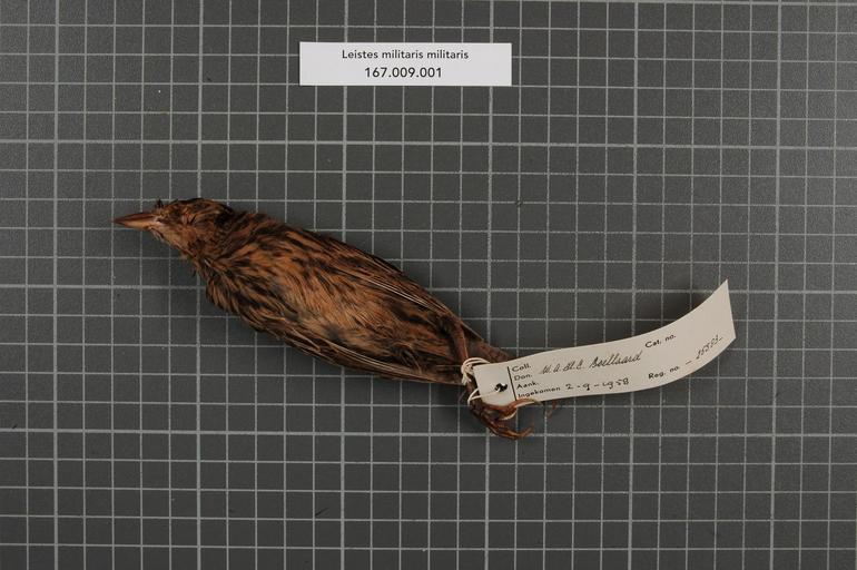 | Keywords: Naturalis Biodiversity Center - RMNH.AVES.25583 1 - Leistes militaris militaris (Linnaeus, 1758) - Icteridae - bird skin specimen.jpeg artwork Dimensions artwork Document type Icteridae Leistes Individual count 1 Infraspecific epithet militaris Infraspecific rank Institution Naturalis Kind of unit artwork Kind of unit specimen skin Life stage Suriname Medium artwork Nomenclatural code Occurrence ID page Other fields Other versions artwork Permission license Naturalis donation CC-0 Publication location Scientific name Leistes militaris militaris Linnaeus 1758 Scientific name authorship Linnaeus 1758 Source url http //bioportal naturalis nl Specific epithet militaris State or province Subject keywords artwork Subject keywords publication Title artwork Title publication Type status Uploaded with GWToolset Naturalis_Biodiversity_Center_-_RMNH AVES 25583_1_-_Leistes_militaris_militaris_ Linnaeus _1758 _-_Icteridae_-_bird_skin_specimen http //medialib naturalis nl/file/id/RMNH AVES 25583_1/format/large Media donated by Naturalis Biodiversity Center Songbird specimens at Naturalis Biodiversity Center Sturnella militaris |