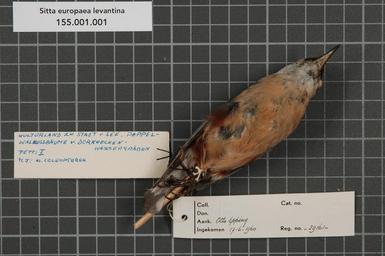 | Keywords: Naturalis Biodiversity Center - RMNH.AVES.29161 2 - Sitta europaea levantina Hartert, 1905 - Sittidae - bird skin specimen.jpeg artwork Dimensions artwork Document type Sittidae Sitta Individual count 1 Infraspecific epithet levantina Infraspecific rank Institution Naturalis Kind of unit artwork Kind of unit specimen skin Life stage Türkei Burdur Medium artwork Nomenclatural code Bodily condition Fett I ADDITIONAL info see drawing dot in circle Country remark on label Tür Occurrence ID page Other fields Other versions artwork Permission license Naturalis donation CC-0 Publication location Scientific name Sitta europaea levantina Hartert 1905 Scientific name authorship Hartert 1905 male Source url http //bioportal naturalis nl Specific epithet europaea State or province Burdur Subject keywords artwork Subject keywords publication Title artwork Title publication Type status Uploaded with GWToolset Naturalis_Biodiversity_Center_-_RMNH AVES 29161_2_-_Sitta_europaea_levantina_Hartert _1905_-_Sittidae_-_bird_skin_specimen http //medialib naturalis nl/file/id/RMNH AVES 29161_2/format/large Media donated by Naturalis Biodiversity Center Songbird specimens at Naturalis Biodiversity Center Sitta europaea Sitta |