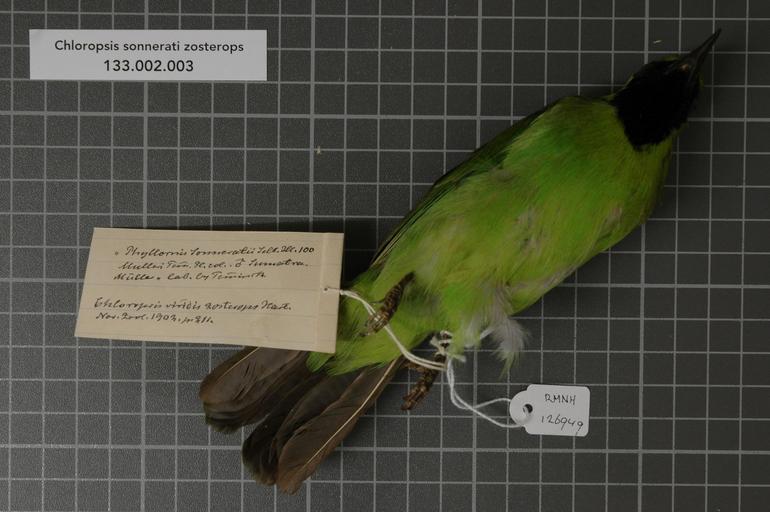 | Keywords: Naturalis Biodiversity Center - RMNH.AVES.126949 2 - Chloropsis sonnerati zosterops Vigors & Horsfield, 1830 - Irenidae - bird skin specimen.jpeg artwork Dimensions artwork Document type Irenidae Chloropsis Individual count 1 Infraspecific epithet zosterops Infraspecific rank Kind of unit artwork Kind of unit specimen skin Life stage Indonesia W Sumatra Medium artwork Nomenclatural code Additional label info Phyllornis Sonneratii Selb Hl 100 Mulleri Temm Pl col male Sumatra Müller lab by Temminck Sex remark on label male lab Occurrence ID Other fields Other versions artwork Permission license Naturalis donation CC-0 Publication location Scientific name Chloropsis sonnerati zosterops Vigors Horsfield 1830 Scientific name authorship Vigors Horsfield 1830 male Source url Specific epithet sonnerati State or province W Sumatra Subject keywords artwork Subject keywords publication Title artwork Title publication Type status Uploaded with GWToolset Naturalis_Biodiversity_Center_-_RMNH AVES 126949_2_-_Chloropsis_sonnerati_zosterops_Vigors_ _Horsfield _1830_-_Irenidae_-_bird_skin_specimen http //medialib naturalis nl/file/id/RMNH AVES 126949_2/format/large Media donated by Naturalis Biodiversity Center Songbird specimens at Naturalis Biodiversity Center Chloropsis sonnerati Chloropsis |