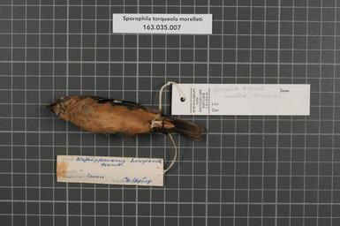 | Keywords: Naturalis Biodiversity Center - RMNH.AVES.34669 2 - Sporophila torqueola morelleti (Bonaparte, 1851) - Emberizidae - bird skin specimen.jpeg artwork Dimensions artwork Document type Emberizidae Sporophila Individual count 1 Infraspecific epithet morelleti Infraspecific rank Institution Naturalis Kind of unit artwork Kind of unit specimen skin Life stage Mexico Veracruz Fortin Medium artwork Nomenclatural code Bodily condition Fett II Sex remark on label male Occurrence ID page Other fields Other versions artwork Permission license Naturalis donation CC-0 Publication location Scientific name Sporophila torqueola morelleti Bonaparte 1851 Scientific name authorship Bonaparte 1851 male Source url http //bioportal naturalis nl Specific epithet torqueola State or province Veracruz Subject keywords artwork Subject keywords publication Title artwork Title publication Type status Uploaded with GWToolset Naturalis_Biodiversity_Center_-_RMNH AVES 34669_2_-_Sporophila_torqueola_morelleti_ Bonaparte _1851 _-_Emberizidae_-_bird_skin_specimen http //medialib naturalis nl/file/id/RMNH AVES 34669_2/format/large Media donated by Naturalis Biodiversity Center Songbird specimens at Naturalis Biodiversity Center Sporophila torqueola Sporophila |