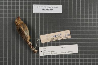 | Keywords: Naturalis Biodiversity Center - RMNH.AVES.35079 1 - Sporophila torqueola torqueola (Bonaparte, 1851) - Emberizidae - bird skin specimen.jpeg artwork Dimensions artwork Document type Emberizidae Sporophila Individual count 1 Infraspecific epithet torqueola Infraspecific rank Institution Naturalis Kind of unit artwork Kind of unit specimen skin Life stage Oaxaca Loma Bonita Rancho Las Vegas Medium artwork Nomenclatural code Bodily condition Fett II Occurrence ID page Other fields Other versions artwork Permission license Naturalis donation CC-0 Publication location Scientific name Sporophila torqueola torqueola Bonaparte 1851 Scientific name authorship Bonaparte 1851 female Source url http //bioportal naturalis nl Specific epithet torqueola State or province Oaxaca Subject keywords artwork Subject keywords publication Title artwork Title publication Type status Uploaded with GWToolset Naturalis_Biodiversity_Center_-_RMNH AVES 35079_1_-_Sporophila_torqueola_torqueola_ Bonaparte _1851 _-_Emberizidae_-_bird_skin_specimen http //medialib naturalis nl/file/id/RMNH AVES 35079_1/format/large Media donated by Naturalis Biodiversity Center Songbird specimens at Naturalis Biodiversity Center Sporophila torqueola Sporophila |