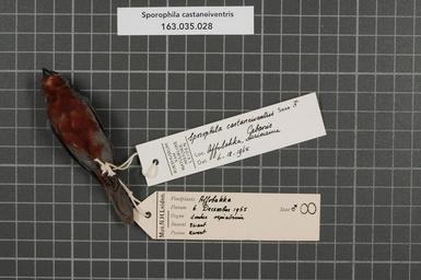 | Keywords: Naturalis Biodiversity Center - RMNH.AVES.38190 2 - Sporophila castaneiventris Cabanis, 1849 - Emberizidae - bird skin specimen.jpeg artwork Dimensions artwork Document type Emberizidae Sporophila Individual count 1 Infraspecific epithet Infraspecific rank Institution Naturalis Kind of unit artwork Kind of unit specimen skin Life stage Suriname Affobakka Medium artwork Nomenclatural code Occurrence ID page Other fields Other versions artwork Permission license Naturalis donation CC-0 Publication location Scientific name Sporophila castaneiventris Cabanis 1849 Scientific name authorship Cabanis 1849 male Source url http //bioportal naturalis nl Specific epithet castaneiventris State or province Subject keywords artwork Subject keywords publication Title artwork Title publication Type status Uploaded with GWToolset Naturalis_Biodiversity_Center_-_RMNH AVES 38190_2_-_Sporophila_castaneiventris_Cabanis _1849_-_Emberizidae_-_bird_skin_specimen http //medialib naturalis nl/file/id/RMNH AVES 38190_2/format/large Media donated by Naturalis Biodiversity Center Songbird specimens at Naturalis Biodiversity Center Sporophila castaneiventris Sporophila |