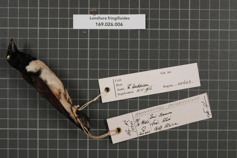 | Keywords: Naturalis Biodiversity Center - RMNH.AVES.44603 1 - Lonchura fringilloides Lafresnaye, 1835 - Estrildidae - bird skin specimen.jpeg artwork Dimensions artwork Document type Estrildidae Lonchura Individual count 1 Infraspecific epithet Infraspecific rank Institution Naturalis Kind of unit artwork Kind of unit specimen skin Life stage Tanzania Mtwara Distr Mikindani Medium artwork Nomenclatural code Occurrence ID page Other fields Other versions artwork Permission license Naturalis donation CC-0 Publication location Scientific name Lonchura fringilloides Lafresnaye 1835 Scientific name authorship Lafresnaye 1835 female Source url http //bioportal naturalis nl Specific epithet fringilloides State or province Mtwara Distr Subject keywords artwork Subject keywords publication Title artwork Title publication Type status Uploaded with GWToolset Naturalis_Biodiversity_Center_-_RMNH AVES 44603_1_-_Lonchura_fringilloides_Lafresnaye _1835_-_Estrildidae_-_bird_skin_specimen http //medialib naturalis nl/file/id/RMNH AVES 44603_1/format/large Media donated by Naturalis Biodiversity Center Songbird specimens at Naturalis Biodiversity Center Lonchura fringilloides Lonchura |