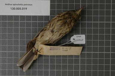 | Keywords: Naturalis Biodiversity Center - RMNH.AVES.128508 2 - Anthus spinoletta petrosus (Montagu, 1798) - Motacillidae - bird skin specimen.jpeg artwork Dimensions artwork Document type Motacillidae Anthus Individual count 1 Infraspecific epithet petrosus Infraspecific rank Institution Naturalis Kind of unit artwork Kind of unit specimen skin Life stage Bohuslän Medium artwork Nomenclatural code Additional info GK Occurrence ID page Other fields Other versions artwork Permission license Naturalis donation CC-0 Publication location Scientific name Anthus spinoletta petrosus Montagu 1798 Scientific name authorship Montagu 1798 female Source url http //bioportal naturalis nl Specific epithet spinoletta State or province Bohuslän Subject keywords artwork Subject keywords publication Title artwork Title publication Type status Uploaded with GWToolset Naturalis_Biodiversity_Center_-_RMNH AVES 128508_2_-_Anthus_spinoletta_petrosus_ Montagu _1798 _-_Motacillidae_-_bird_skin_specimen http //medialib naturalis nl/file/id/RMNH AVES 128508_2/format/large Media donated by Naturalis Biodiversity Center Songbird specimens at Naturalis Biodiversity Center Anthus petrosus museum specimens |