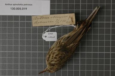 | Keywords: Naturalis Biodiversity Center - RMNH.AVES.128508 1 - Anthus spinoletta petrosus (Montagu, 1798) - Motacillidae - bird skin specimen.jpeg artwork Dimensions artwork Document type Motacillidae Anthus Individual count 1 Infraspecific epithet petrosus Infraspecific rank Institution Naturalis Kind of unit artwork Kind of unit specimen skin Life stage Bohuslän Medium artwork Nomenclatural code Additional info GK Occurrence ID page Other fields Other versions artwork Permission license Naturalis donation CC-0 Publication location Scientific name Anthus spinoletta petrosus Montagu 1798 Scientific name authorship Montagu 1798 female Source url http //bioportal naturalis nl Specific epithet spinoletta State or province Bohuslän Subject keywords artwork Subject keywords publication Title artwork Title publication Type status Uploaded with GWToolset Naturalis_Biodiversity_Center_-_RMNH AVES 128508_1_-_Anthus_spinoletta_petrosus_ Montagu _1798 _-_Motacillidae_-_bird_skin_specimen http //medialib naturalis nl/file/id/RMNH AVES 128508_1/format/large Media donated by Naturalis Biodiversity Center Songbird specimens at Naturalis Biodiversity Center Anthus petrosus museum specimens |