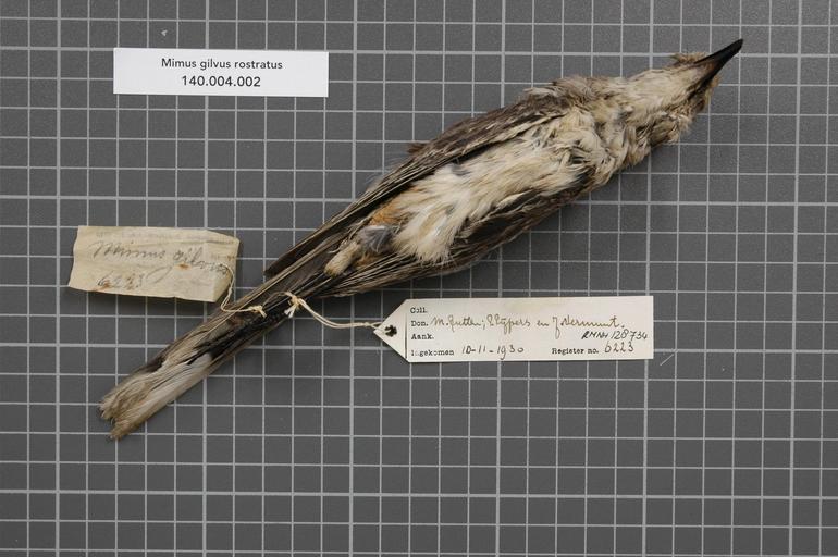 | Keywords: Naturalis Biodiversity Center - RMNH.AVES.128734 2 - Mimus gilvus rostratus Ridgway, 1884 - Mimidae - bird skin specimen.jpeg artwork Dimensions artwork Document type Mimidae Mimus Individual count 1 Infraspecific epithet rostratus Infraspecific rank Institution Naturalis Kind of unit artwork Kind of unit specimen skin Life stage Medium artwork Nomenclatural code Region remark on field label Benedenwindsche - Eil Occurrence ID page Other fields Other versions artwork Permission license Naturalis donation CC-0 Publication location Scientific name Mimus gilvus rostratus Ridgway 1884 Scientific name authorship Ridgway 1884 Source url http //bioportal naturalis nl Specific epithet gilvus State or province Aruba Subject keywords artwork Subject keywords publication Title artwork Title publication Type status Uploaded with GWToolset Naturalis_Biodiversity_Center_-_RMNH AVES 128734_2_-_Mimus_gilvus_rostratus_Ridgway _1884_-_Mimidae_-_bird_skin_specimen http //medialib naturalis nl/file/id/RMNH AVES 128734_2/format/large Media donated by Naturalis Biodiversity Center Songbird specimens at Naturalis Biodiversity Center Mimus gilvus museum specimens |